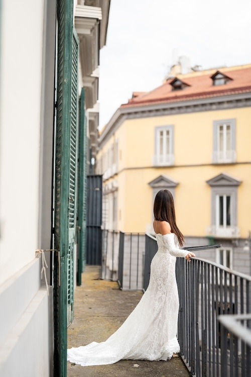 Anche il modello Decumani è caratterizzato da uno scollo a spalle scoperte ma le maniche, in questo caso, ricordano delle bretelle che scendono morbide sulle braccia accarezzando la pelle con romantici ricami floreali. Tutto il corpetto è un tripudio di bucolici ricami che si fondono dal punto della vita in giù con un tessuto liscio semplice con il quale è stata realizzata la gonna aderente a sirena. Il lungo strascico, anch’esso impreziosito dagli stessi ricami del corpetto, rende ogni movimento della sposa morbido, leggero ed elegante.