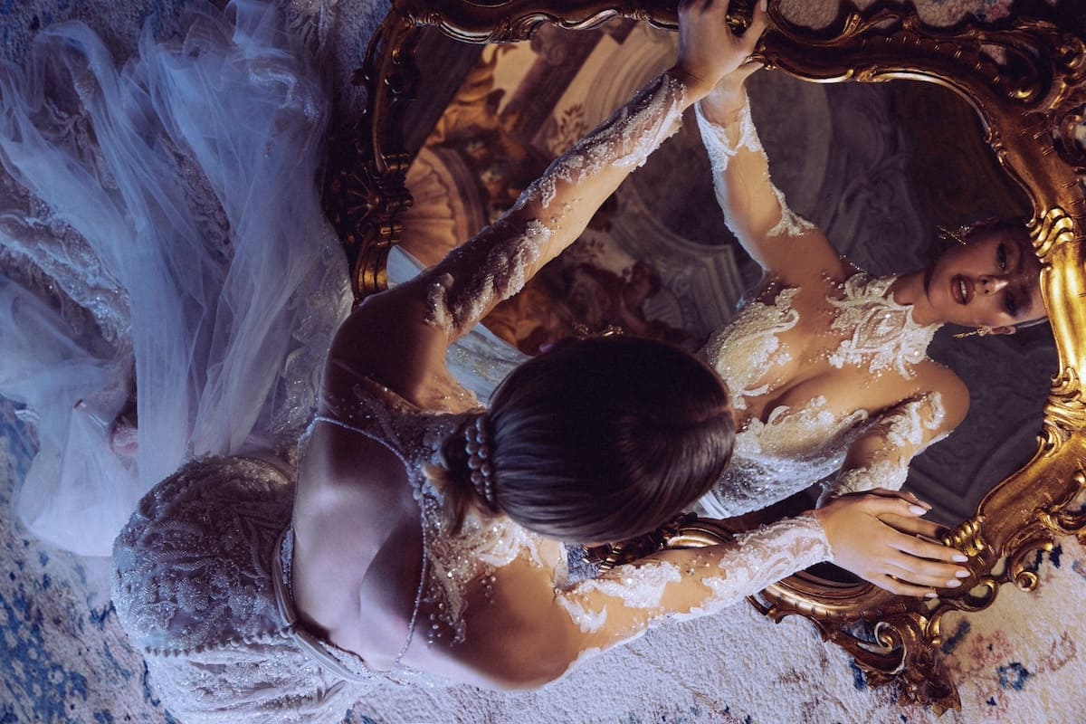 Il pizzo, invece, è il tessuto della maestria artigianale: capace di adattarsi abilmente a qualsiasi periodo storico e stile, è ideale per creare scolli più netti e strutturati come quelli a V (sì, anche sulla schiena). Che si tratti di un abito a sirena oppure di un abito principesco, il pizzo riuscirà a incarnare alla perfezione l’abito che hai sempre desiderato indossare nel giorno del tuo matrimonio incorniciando alla perfezione la schiena nuda.