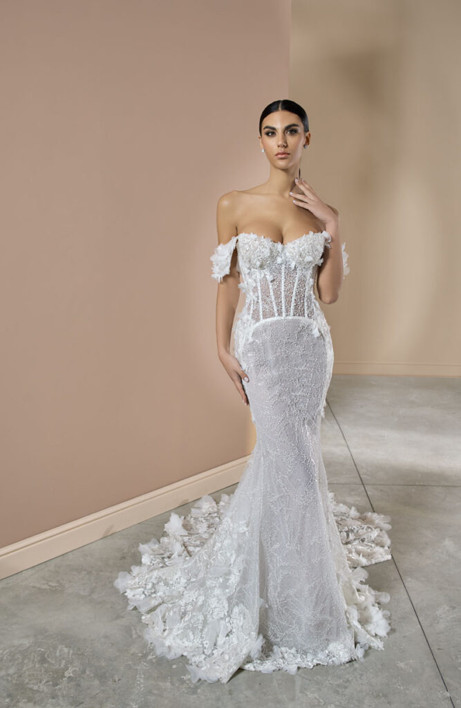 Gemini è la prova che lo scollo a cuore può essere anche audace, magnetico e assolutamente couture. La costruzione effetto bustier, interamente realizzata in pizzo ricamato su base microrete, modella la silhouette con precisione sartoriale. Lo scollo a cuore è il palcoscenico per una decorazione spettacolare: petali tridimensionali in organza di seta e cristalli Swarovski donano volume e riflessi luminosi, catturando ogni sguardo. La gonna scivola aderente, aprendosi in una sontuosa coda ricamata dove si intrecciano pizzo macramè e applicazioni floreali. A completare questo capolavoro, un giacchino in pizzo con ampie maniche e scollo all’americana che conferisce un tocco di avanguardia all’intero ensemble. Gemini è per la sposa che non ha paura di osare, per chi vive la moda come un’espressione della propria unicità e desidera un abito che non si spiega, ma si riconosce.