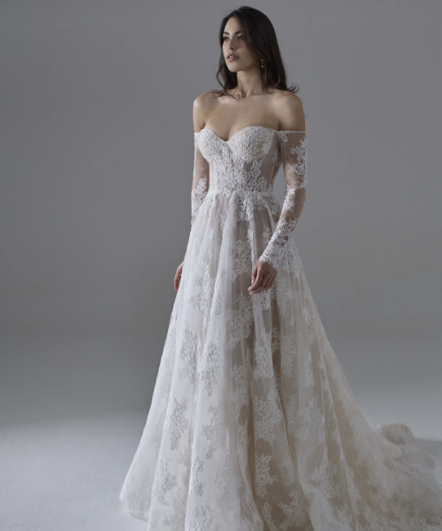 Se lo scollo a cuore è il simbolo del romanticismo, l’abito Minako ne è la sua più alta celebrazione. Questa creazione della collezione Privé è un inno all’eleganza, un sogno principesco che prende forma. Realizzato interamente in prezioso pizzo rebrodè, Minako fonde la classe con l’eccellenza dell’haute couture. Il corpino, con la struttura effetto guêpière, è impreziosito da una scollatura a cuore dolce, che valorizza il décolleté con grazia e delicatezza, lasciando le spalle scoperte. Le maniche lunghe, anch’esse in pizzo, aggiungono un tocco di raffinatezza creando l’equilibrio perfetto tra sensualità e bon ton. La gonna ampia scivola leggera, mentre una cintura sottile sottolinea il punto vita. Minako è l’abito per la sposa che si sente una moderna Giulietta, per chi desidera un’eleganza classica, preziosa e indimenticabile.
