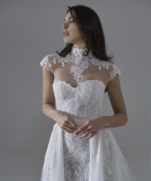 L’abito Miwa dimostra come uno scollo a cuore possa diventare la base per infinite trasformazioni raccontando ogni momento del matrimonio con un volto nuovo ma sempre coerente. Questo modello a sirena in pizzo rebrodè a spot è un capolavoro di versatilità: il corpino strutturato, con scollatura a cuore e coppe preformate, offre un sostegno perfetto e un’eleganza emblematica. La vera magia di Miwa risiede nei suoi accessori distintivi che permettono di creare tre look in uno. Una sopracoda in tulle con inserti in pizzo per un ingresso regale in chiesa, una cintura in mikado con fiocco scultoreo per definire il punto vita con carattere durante il ricevimento e un coprispalle in pizzo con colletto alto per un tocco sofisticato e chic per il taglio della torta. Miwa è la scelta ideale per la sposa dinamica e moderna che non vuole un solo abito ma un racconto che si evolve, un’armonia che sorprende e si rivela in ogni sua versione.