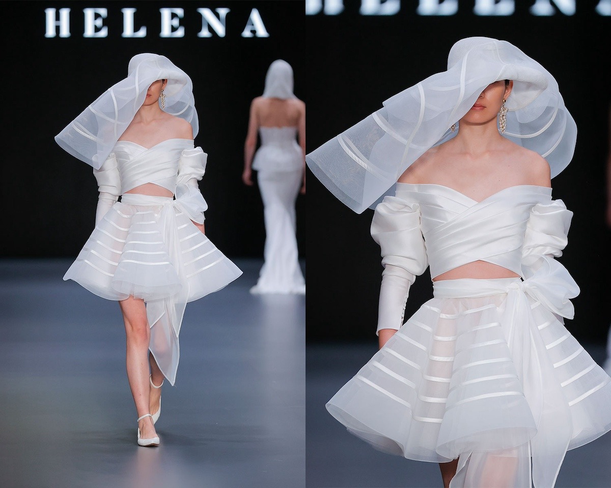 Chi l’ha detto che la classe e l’eleganza possano essere sprigionate solo da un classico abito da sposa lungo? Questo modello nasce proprio per dimostrare che esiste sempre un’eccezione a confermare la regola. La gonna corta e vaporosa, composta da un gioco di crine e fasce in organza, sembra cullare ogni passo della sposa. Il corpino, avvolgente e sensuale, in mikado drappeggiato, scopre delicatamente le spalle ed esalta la linea del collo e le clavicole. Le maniche, morbide e voluminose, ricordano i fasti di epoche passate ma con una rivisitazione moderna e audace. Il cappello a falda extra large, nasconde parzialmente il volto e dona un alone di mistero e fascino che non fa sentire alcuna mancanza del classico velo.
