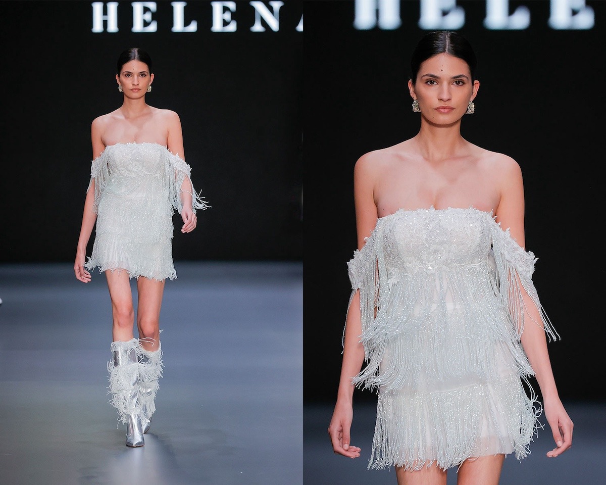 In un gioco di luci e ombre, l’abito in foto rappresenta un sogno scintillante. Il modello avvolge la silhouette in un fascio di brillante eleganza. Ispirato allo stile glamour degli anni ’20, l’abito è completamente ricoperto da frange di brillantini che ondeggiano a ogni movimento, catturando la luce e creando un effetto ipnotico. Ogni dettaglio è curato con amore, il tessuto sembra una cascata di riflessi argentei che danzano sul corpo della sposa che lo indossa. Le spalline cadono morbidamente sulle braccia lasciando spalle e décolleté nudi.