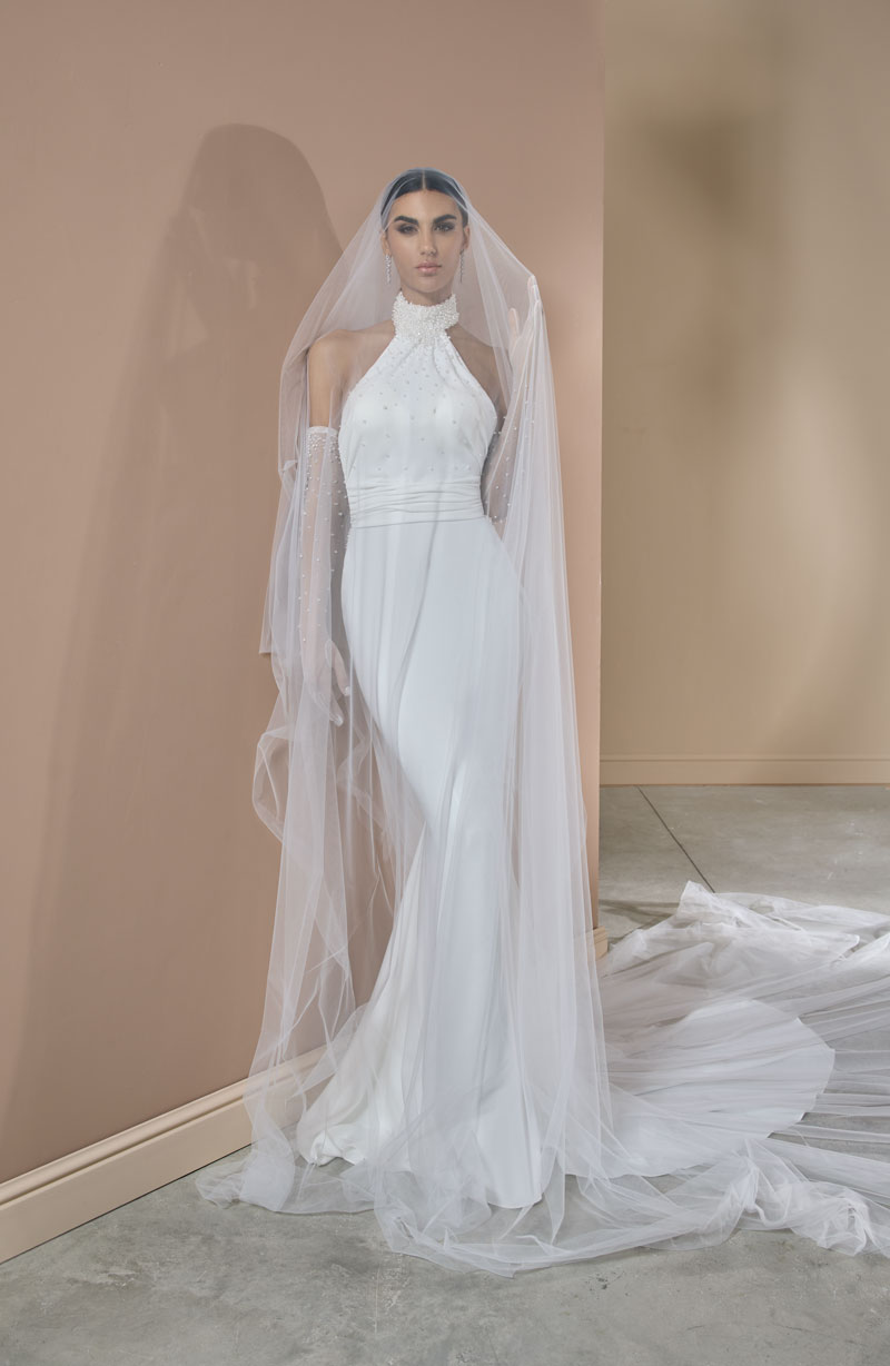 Un tocco di versatilità è dato dai guanti decorati con le stesse perline del corpino e arricchiti da un velo di tulle che scende lungo le braccia, fluttuando con il vento e creando giochi di luce e trasparenze incantevoli. Questi guanti possono essere rimossi in qualsiasi momento, offrendo così una maggiore libertà di movimento per un ballo sotto le stelle o per immergere i piedi nell’acqua salata, subito dopo il “sì”.