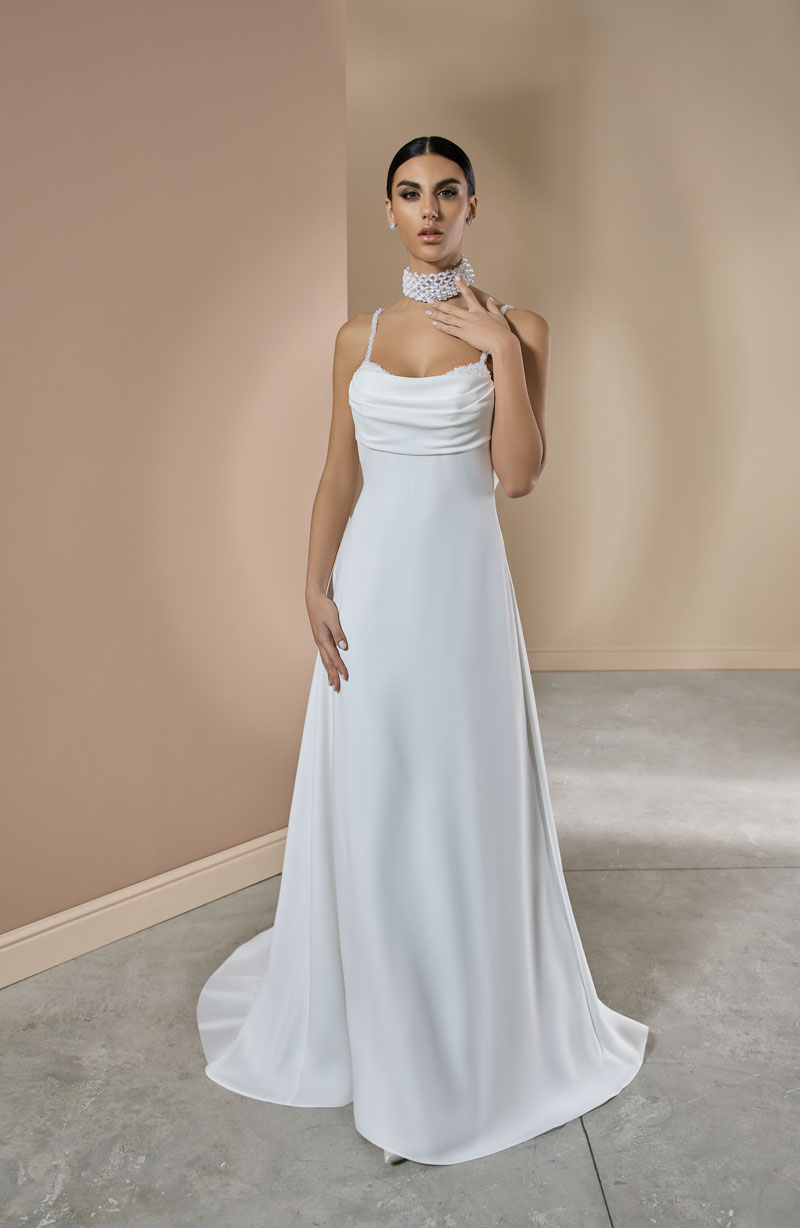 Questo capolavoro di minimalismo raffinato, con il suo taglio scivolato e leggerissimo, è l’alleato ideale per dire “sì” con i piedi nella sabbia e lo sguardo verso l’orizzonte. Il corpino drappeggiato con spalline sottili è un richiamo sottile alla sensualità degli anni ‘90, mentre la scollatura posteriore, così audace da far arrossire anche il mare, scivola in un drappeggio morbido che accarezza la schiena con grazia.