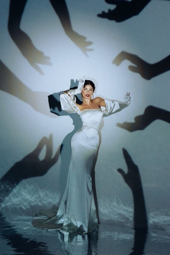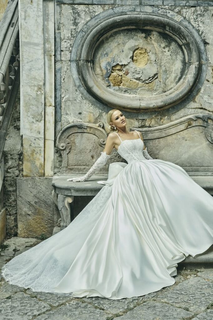 A completare il look ci sono i guanti lunghi, anch’essi in satin: la manica simile a un palloncino incornicia le spalle con un volume delicato, lasciandole elegantemente scoperte e bilanciando la struttura dell’abito con un tocco di leggerezza. Indossando questo bridal look, la sposa diventa un’opera d’arte vivente, un’icona di bellezza pronta a lasciare un segno indelebile in uno dei giorni più importanti della sua vita. È una scelta che parla di personalità, di audacia e di un desiderio intramontabile di sentirsi unica e indimenticabile.