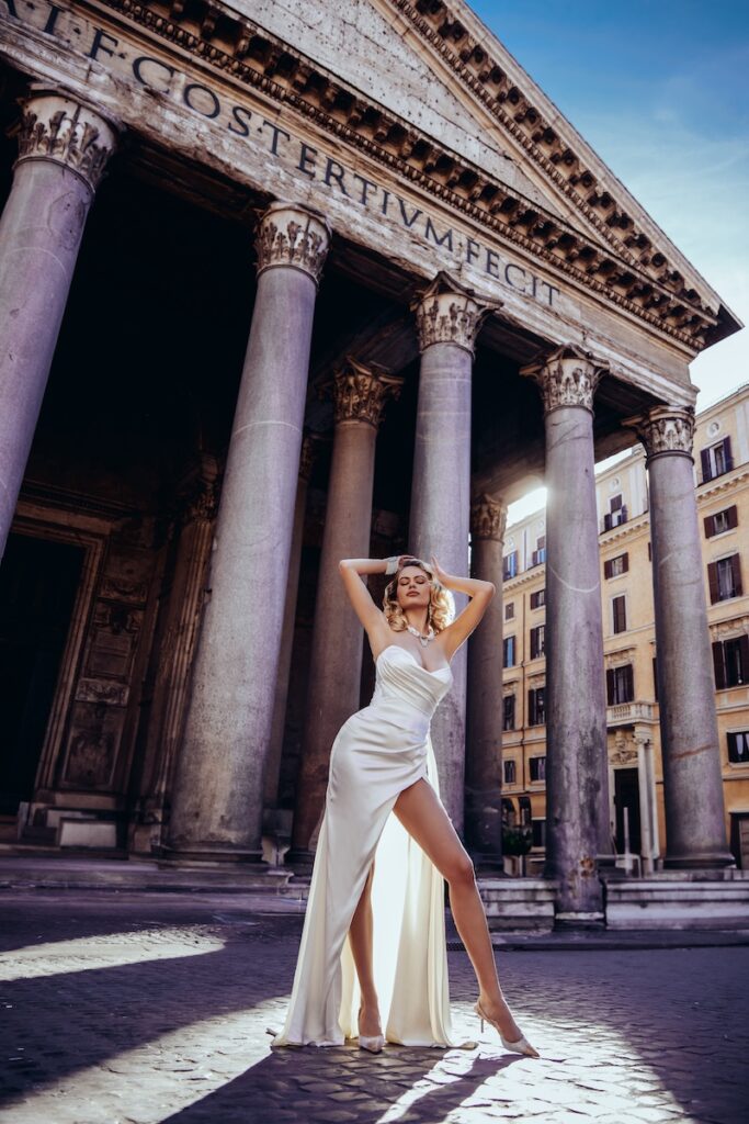 Tutti i suoi dettagli evocano un’estetica precisa: quella delle dive che non avevano bisogno di esagerare per lasciare il segno. L’abito è ideale per fisicità slanciate ma si adatta con intelligenza anche a corpi curvy che vogliono essere valorizzati con charme. Insomma, se nella tua playlist c’è un pizzico di Vecchia Hollywood, questo è l’abito che ti farà sentire come se stessi camminando sul red carpet… con l’unico premio che conta: l’uomo della tua vita che ti promette amore eterno.