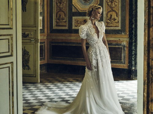 Il corpino strutturato in tulle e pizzo racchiude tutta la maestria sartoriale della Maison: ricami di fiori tridimensionali e piccoli cristalli realizzati a mano creano un gioco di luci e rilievi che donano profondità e splendore alla figura. La scollatura a cuore, resa ancora più seducente dall’effetto illusion del tulle, valorizza il décolleté con eleganza, accennando una sensualità raffinata e mai eccessiva. È il tipo di dettaglio che cattura lo sguardo rendendo la sposa protagonista.