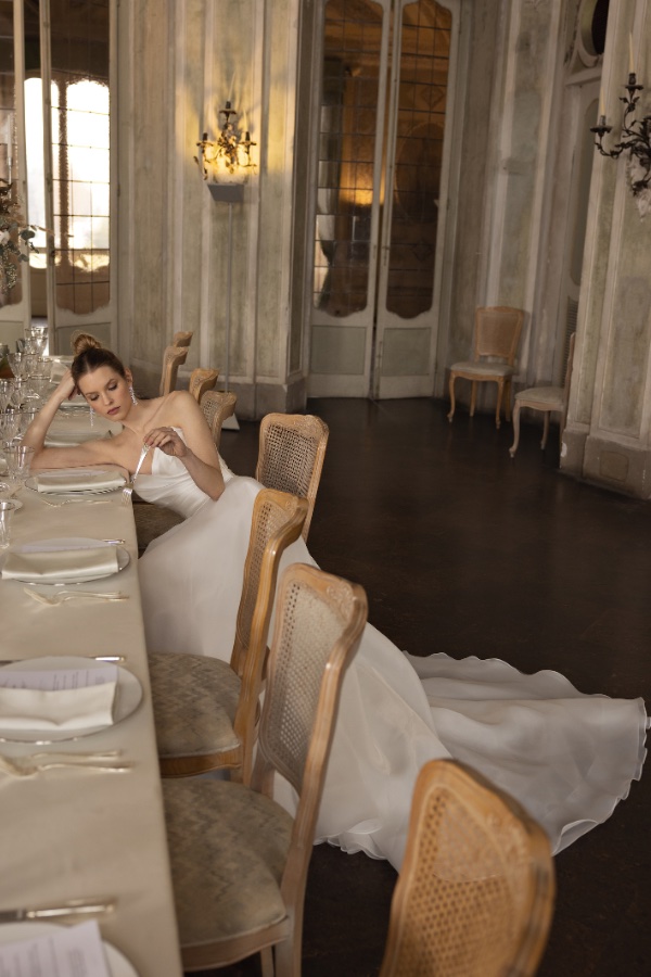 Bogotà è un abito che non ha bisogno di eccessi: la sua raffinatezza risiede proprio nell’essenza minimalista che riesce a mettere in risalto la naturale bellezza della sposa. Si sposa perfettamente con un’acconciatura raccolta o semi raccolta, lasciando spazio a un look che valorizzi il viso e la linea del collo, per un risultato delicato e di forte impatto.