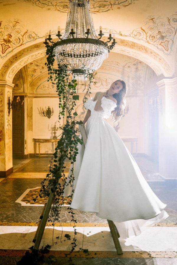 Evelyn è l’abito da sposa che sembra uscito da una fiaba, perfetto per chi desidera sentirsi una principessa moderna nel giorno delle proprie nozze. Il modello si distingue per le spalle scoperte, un dettaglio che esalta con grazia il collo e il décolleté, mentre le mezze maniche, create con rouches eleganti e delicate, aggiungono un tocco di leggerezza. Questi dettagli rendono l’abito straordinariamente romantico. La gonna, ampia e morbida si muove con la sposa come una nuvola luminosa, indossandolo ti sembrerà di essere una principessa delle favole.