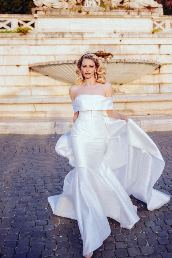 Mirella è un modello a sirena irresistibilmente seducente che abbraccia le forme del corpo con audacia, valorizzando ogni curva e creando una silhouette mozzafiato. La sua particolarità risiede nello scollo a barca, un dettaglio sofisticato che richiama le icone di stile degli anni ’50 e ’60, donando il perfetto stile vintage glamour.