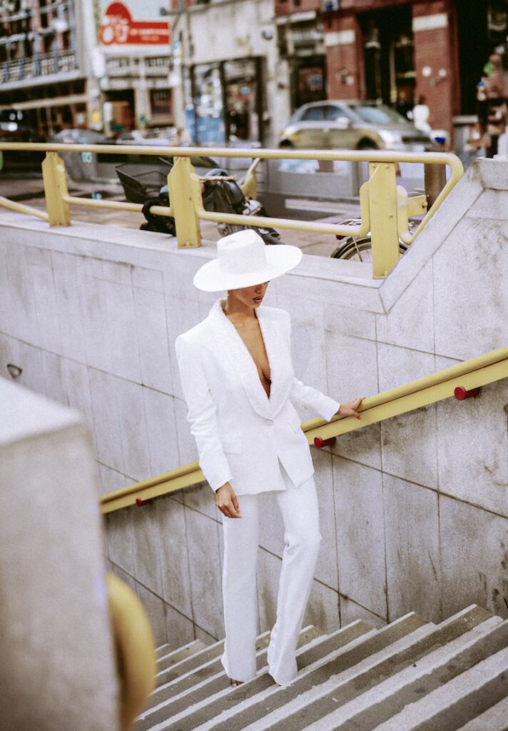 Chi l’ha detto che la sposa debba indossare per forza un abito classico con la gonna svolazzante? Dimentica il tradizionale vestito principesco: qui siamo di fronte a un capo che esprime potenza e raffinatezza in egual misura. Un tailleur bianco immacolato, dal taglio netto, che fonde il rigore con una sensualità magnetica. La giacca, con spalle strutturate e un unico bottone centrale, avvolge la silhouette con precisione e maestria. La scollatura profonda è perfetta per la sposa consapevole e sicura di sé.