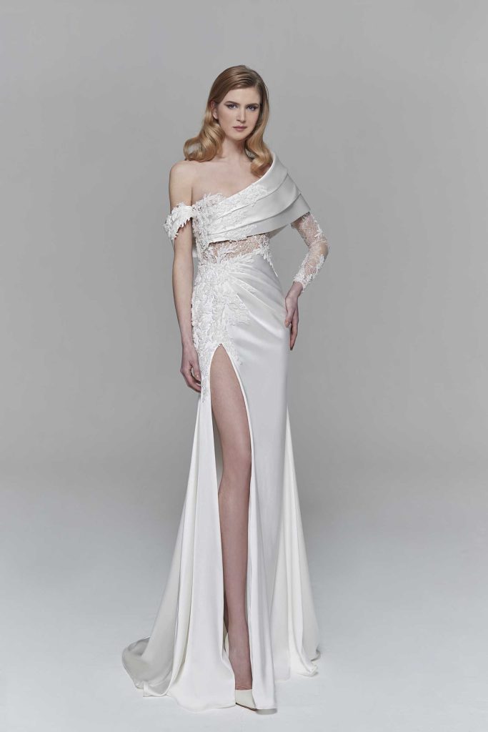 Ogni sposa ha il suo stile e può decidere di esprimere la sua personalità in modo diverso: c’è chi sceglie dei fiocchi, chi opta per corpini e monospalla ricamati, chi decide di impreziosire l’abito con motivi floreali. Oltretutto, la scollatura asimmetrica dona all’abito da sposa movimento e personalità. Insomma, qualsiasi sia il tipo di stile che sceglierai per il tuo abito monospalla, sappi che si tratta di un modello estroso e moderno, in accordo con le tendenze della moda bridal per il 2022-23. Ne è un esempio l’affascinante abito da sposa monospalla della nostra collezione Isabella. Cleopatra è un abito dalle linee molto sensuali, con una gonna asimmetrica in corposo satin e corpino monospalla con manica lunga in pizzo chantilly. A rendere quest’abito così raffinato è il microricamo con applicazioni di cristalli e opali che scendono lungo la gonna.