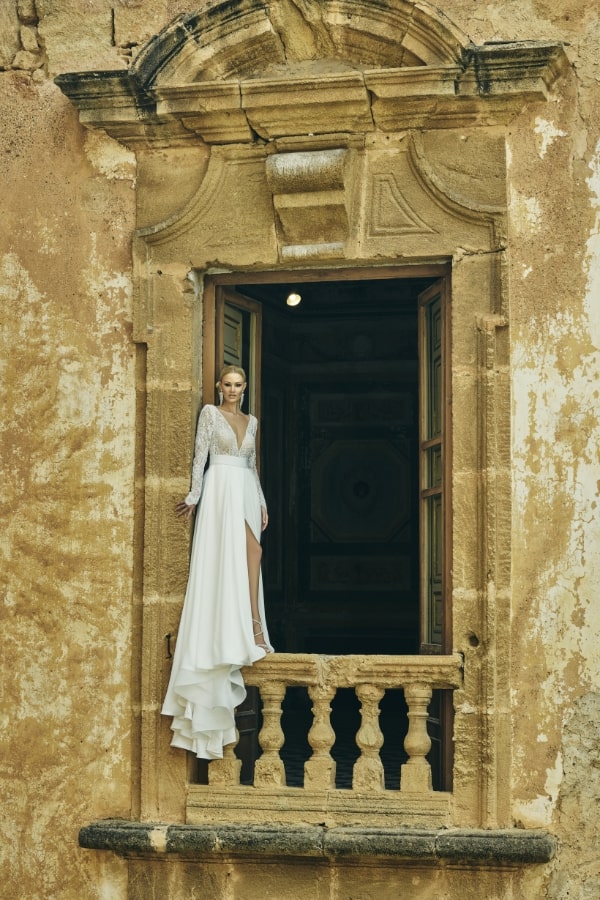 Infine abbiamo Scarlett che con il suo profondo scollo a V e le maniche lunghe impreziosite da cristalli luminosissimi, è una vera dichiarazione di classe. Ogni dettaglio è pensato per esaltare la femminilità della sposa con una sobrietà tale che la rende ancora più affascinante e misteriosa.