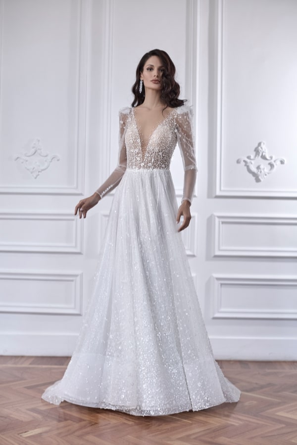 Il corpetto semi trasparente cattura immediatamente l’attenzione, con il suo gioco di luci e ombre che lascia intravedere la pelle senza mai risultare eccessivo. I cristalli, disposti in modo armonioso sul corpetto, donano una luce intensa e affascinante, mentre lo scollo a V aggiunge un tocco di sensualità. Le maniche lunghe in tulle, anch’esse arricchite da cristalli, completano il look, regalando un movimento etereo e raffinato che si muove in armonia con ogni passo della sposa.