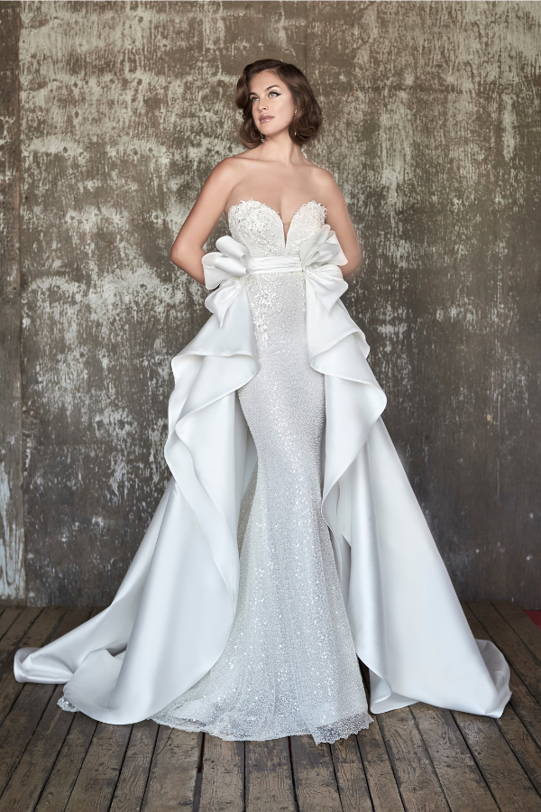Iridea è un abito a sirena con una sopragonna staccabile in mikado di seta che permette di passare con facilità da un look sensuale a uno imponente. Il pizzo ricamato con cristalli, il corpino effetto bustier con scollo profondo a cuore e la gonna a sirena che esalta le curve, rendono Iridea un abito audace e trasformabile.
