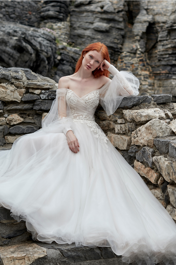 Con il suo design semi-ampio, lo scollo off-shoulder drappeggiato e le maniche ampie in tulle ultraleggero arricchite da pizzo rebrodè, l’abito Narnia evoca un’eleganza fiabesca e romantica. Il corpetto steccato con scollo a cuore valorizza il décolleté e il punto vita, mentre la gonna in tulle di seta fluisce delicatamente, garantendo una linea che non appesantisce la figura.