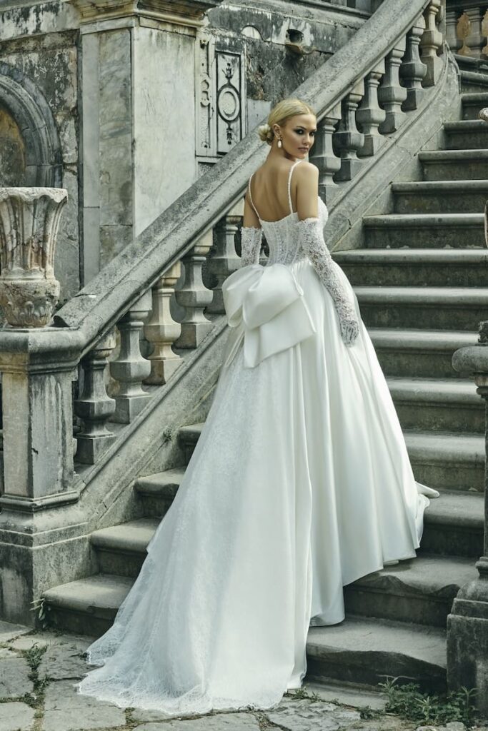 A proposito di tessuti in Mikado, qui in foto puoi ammirare il modello Flora della nostra Maison, la cui gonna voluminosa, con maestoso strascico annesso, è realizzata interamente in tessuto mikado. Per sottolineare la struttura e la rigidità di cui abbiamo parlato poco fa, puoi notare anche un grande fiocco posteriore che scende dal punto vita della sposa e si appoggia dolcemente sulla gonna. Anche il corpino con scollo a cuore è realizzato nello stesso tessuto con deliziose pieghe oblique che riprendono la stessa trama della fascia e del fiocco sul punto vita. Infine, il modello assume un tono romantico grazie al body illusion con ricami floreali effetto tattoo che accarezzano le braccia, la schiena e il décolleté della sposa.