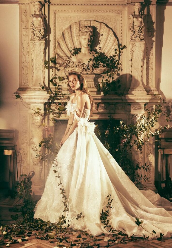 Santa Chiara è un modello principesco dal corpino steccato a forma di cuore, audace (grazie al profondo scollo a V con tulle illusion sul décolleté) e romantico (proprio per il tipo di tessuto adoperato nella creazione del capo). Dal punto vita ben delineato parte un tripudio di pizzo che dà vita a una gonna morbida e voluminosa, perfetta per chi vuole sentirsi come una principessa nel suo grande giorno. Le maniche, anch’esse in pizzo rebrodè, sono removibili e permettono di dare una rinfrescata al look in pochi secondi decidendo di indossarle – magari per il rito nuziale – e poi rimuoverle per godersi la cerimonia e i festeggiamenti.