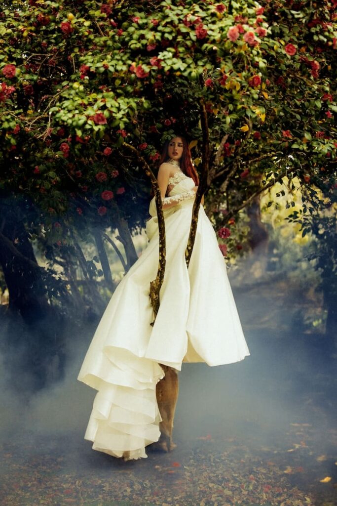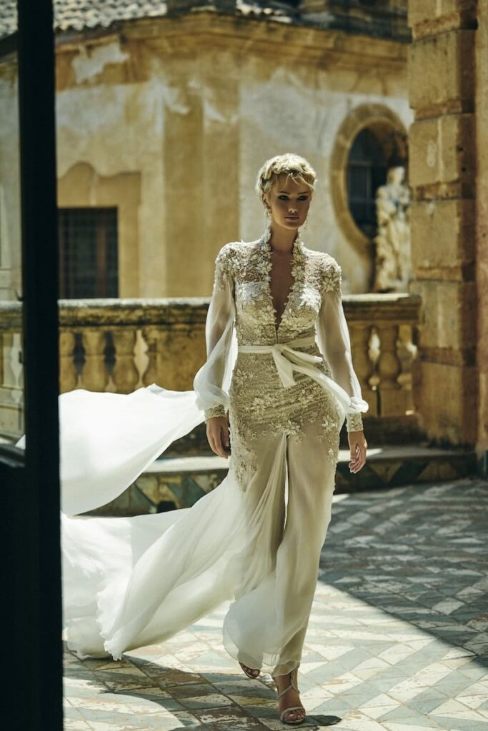 La gonna, dalla linea scivolata, è interamente realizzata in chiffon e vanta uno spacco centrale che rende il modello estremamente audace. Il retro dell’abito ha uno scollo ad oblò che può essere valorizzato dal lungo mantello in chiffon (che puoi decidere di rimuovere in qualsiasi momento) che funge da strascico. Le maniche balloon sono anch’esse in chiffon e donano al look un pizzico di romanticismo che non guasta mai.