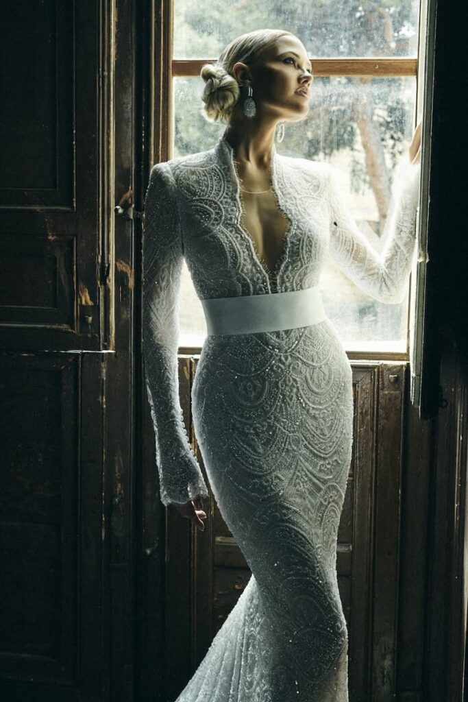 Sul retro, l’abito è impreziosito da una fila di bottoncini delicati sulla schiena che rendono il modello vintage al punto giusto. Le maniche lunghe, realizzate nello stesso pizzo del resto dell’abito, rendono ancora più sofisticata la sposa. Infine, la larga fascia sul punto vita delinea alla perfezione la silhouette.