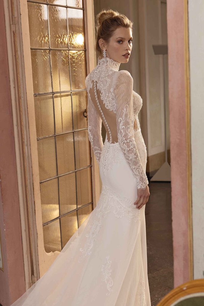L’abito da sposa invernale si trasforma in un abito di grande personalità grazie allo scollo a V. Il modello Shanghai della collezione Sofia descrive perfettamente questa dualità di sensazioni: il corpino in pizzo con collo alto lavorato si apre sul seno con un’apertura a V centrale fino in vita. La manica è lunga, con un po’ di volume sulla spalla, ma lascia la schiena in trasparenza, ad accezione della chiusura in bottoncini lungo tutto lo schienale. Si tratta di un abito perfetto per la stagione invernale grazie al quale non dovrai rinunciare al tuo desiderio di sensualità misto a grande raffinatezza.