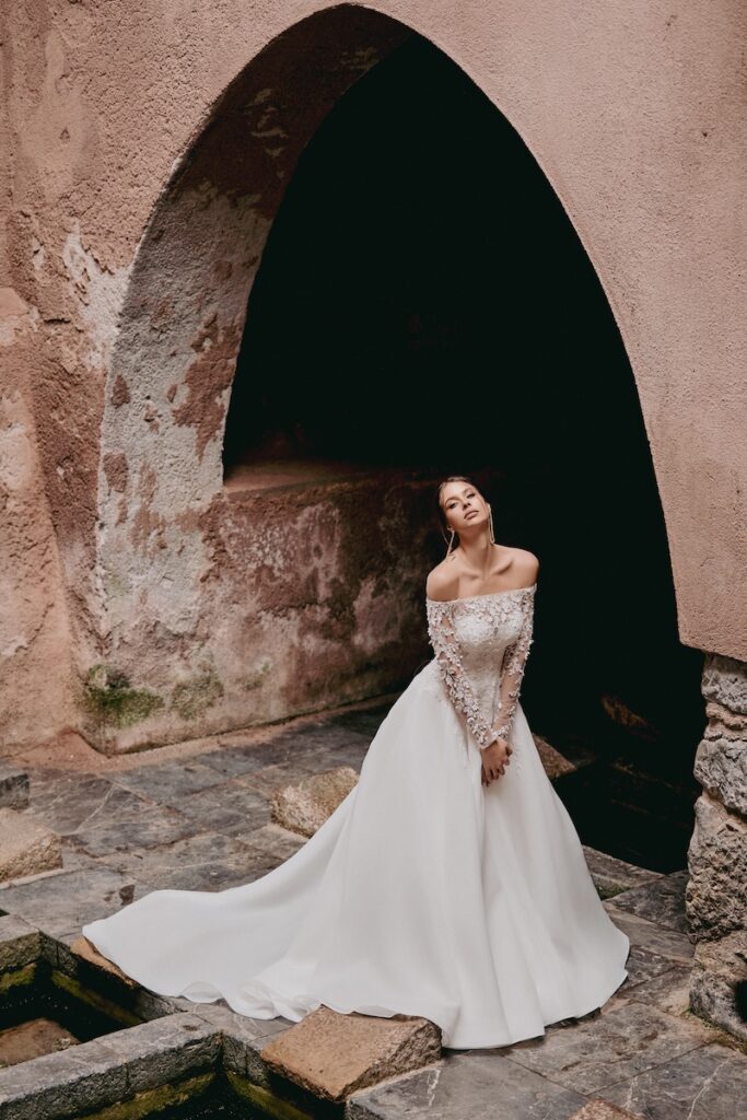 Un perfetto esempio di questo stile è l’abito Port’Alba, un modello a principessa dalla linea redingote che unisce la maestosità del taglio classico a dettagli sartoriali moderni. Il corpino steccato modellante in organza, decorato con pizzo foliage tridimensionale, scolpisce il busto esaltando il punto vita, mentre lo scollo off-shoulder con coppe autoreggenti aggiunge il giusto pizzico di sensualità. Il pizzo illusion sul retro e le maniche lunghe coordinano l’insieme con raffinata armonia, rendendolo ideale per cerimonie solenni, in grandi chiese o castelli e perfetto per tutte le fisicità, comprese quelle curvy.
