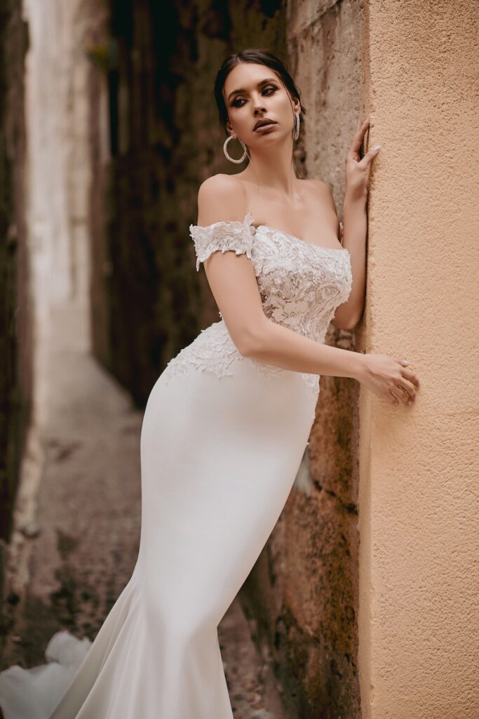Un perfetto esempio di abito a sirena che unisce sensualità, artigianalità e stile è l’abito Decumani, ispirato all’omonimo quartiere storico di Napoli. Questo modello racchiude l’eleganza e il fascino delle strade napoletane e rappresenta una vera celebrazione della femminilità. Realizzato in cady con un corpino steccato in pizzo rebrodé e una scollatura off-shoulder con mezze maniche, avvolge il corpo con classe, mentre i dettagli in pizzo e la coda intagliata in tulle donano un aspetto estremamente romantico. Il retro, con la sua fila di bottoncini e le applicazioni di cristalli e canottiglie, aggiunge classe ed eleganza.