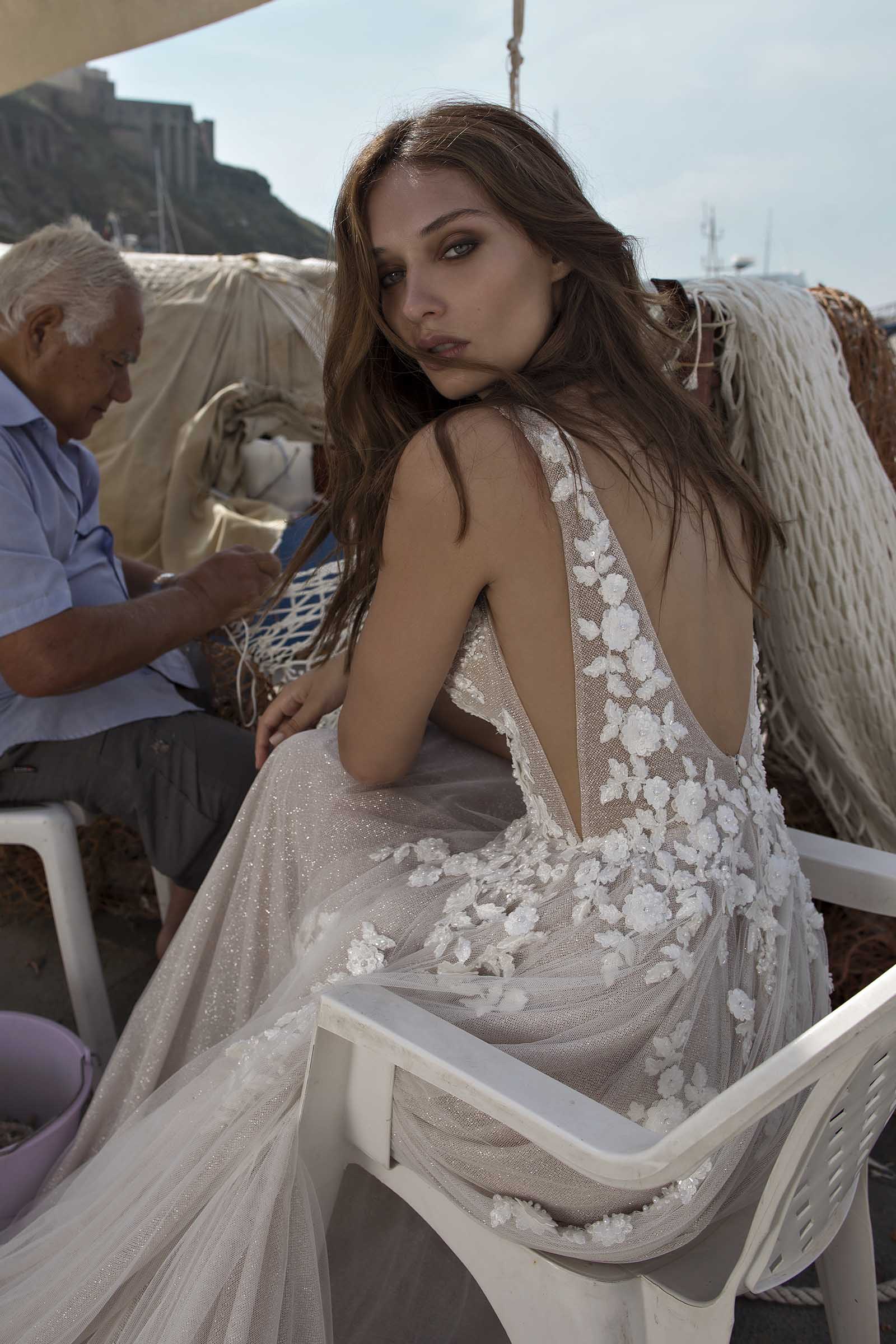 - Il dettaglio dei fiori 3D che scendono dal corpino alla gonna con un gioco di seduzione, raffinatezza e personalità;