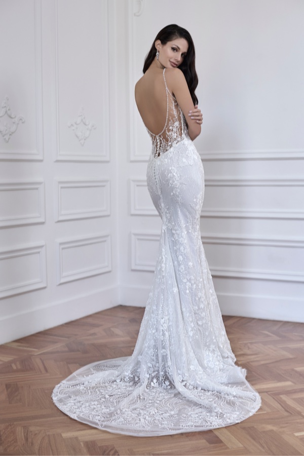 Andalusite is a mermaid wedding gown entirely adorned with embroidered floral lace and enriched with 3D floral appliqués, crystals, and pearls that create a shimmering, sophisticated effect. The structured corset-like bodice, made in embroidered lace, embraces the décolleté and features a deep, sensual neckline enhanced by illusion tulle. Delicate and thin straps add a touch of sensual elegance, perfectly framing the shoulders.