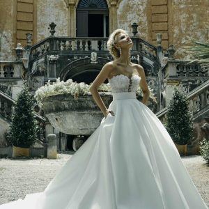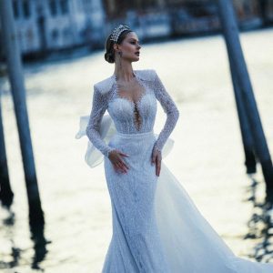 Berillo evokes the purity and sparkle of a precious gem. Wearing it means feeling gently embraced in a cloud of sensuality and lightness. A design that blends modernity and royalty, enhancing every bride’s beauty.