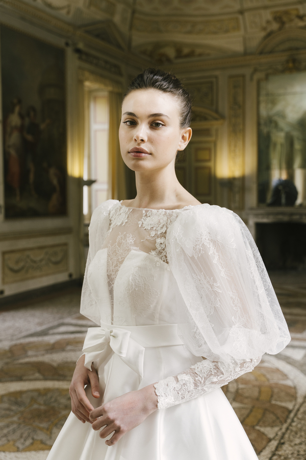 2. l’altro in pizzo chantilly con medaglioni di pizzo ricamato, scollo chiuso e maniche lunghe a sbuffo, effetto balloon, staccabili per un tocco romantico e delicato.