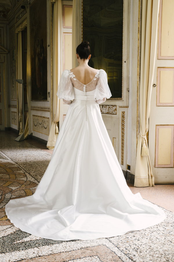 L’abito da sposa a principessa in mikado, con tagli redingote, esalta la figura con eleganza e semplicità.