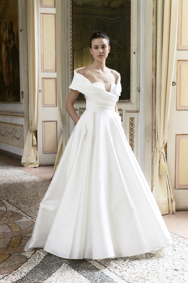 La gonna ampia in mikado con tagli redingote scivola elegantemente, conferendo maestosità al capo senza appesantire la figura.
