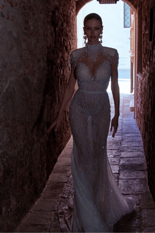 Inspired by the most iconic red carpet dresses, Demi is designed for the bride who wants to shineaffirm her femininity and exude elegance with confidence. Every detail, every glimmer of light reflecting off its crystal embellishments, tells a story of luxury and magic.