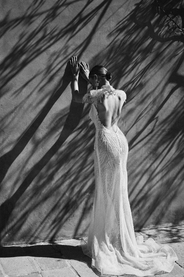 Demi is a fit & flare mermaid gown made in embroidered lace and fully adorned with crystal and Swarovski appliqués, forming an exquisitely sophisticated geometric foliage pattern. The fabric’s subtle sheerness creates a mesmerizing game of transparencies, embracing the figure in sensuality without ever compromising elegance.