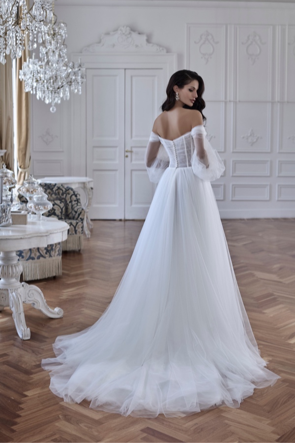 The voluminous silk-touch tulle skirt flows effortlessly, creating a harmonious movement that becomes even more dramatic thanks to a side slit. The back of the gown features a straight neckline, completing the design with balance and simplicity. Long puffed sleeves in sheer tulle, gracefully extending from the off-the-shoulder straps, add a regal and romantic touch.