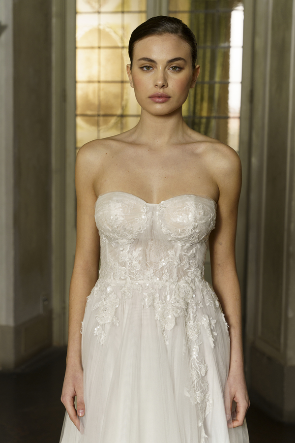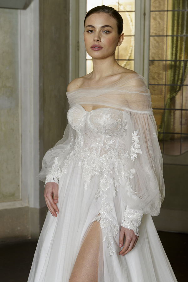 The boned bodice has a sweetheart neckline, made in silk tulle and enriched with draped lace interweaving. The dress is completed with a ring shrug and puff sleeves in tulle.