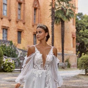 The dress’ highlight is the removable tulle overskirt with embroidered lace: perfect to switch the look from ceremony to the after party; it screams majesty, making every entrance unforgettable.