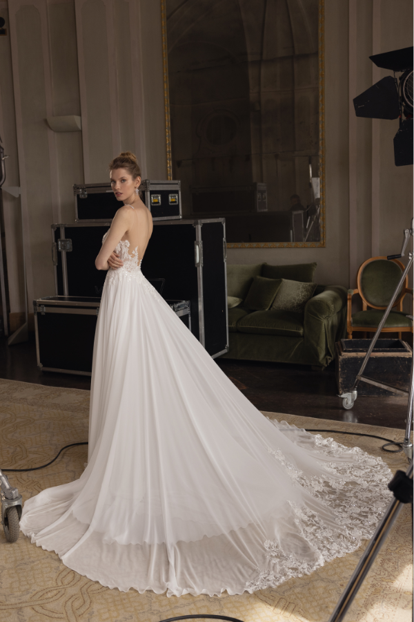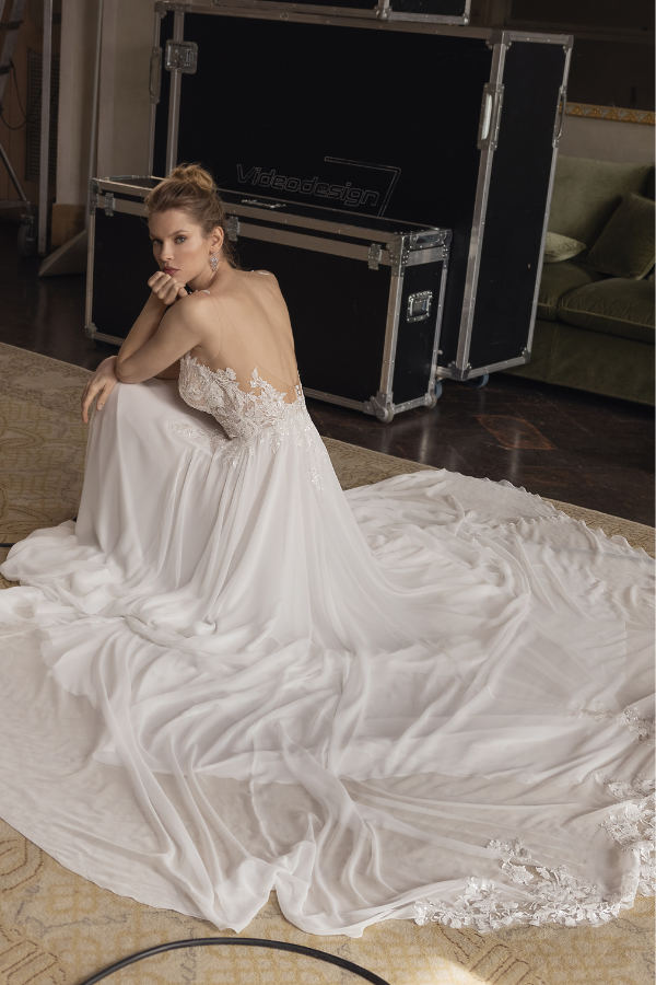 Madrid is a slinky wedding dress in soft chiffon with carved lace on the tail.