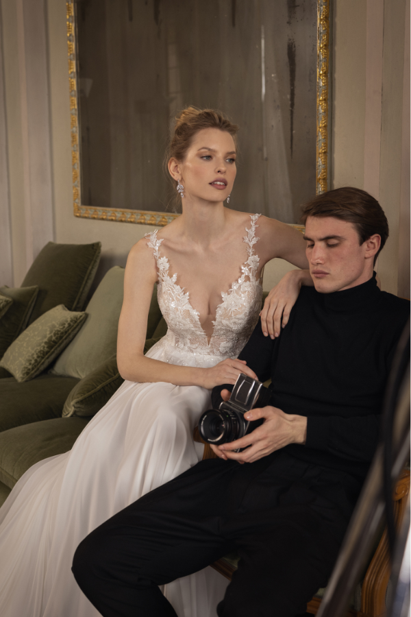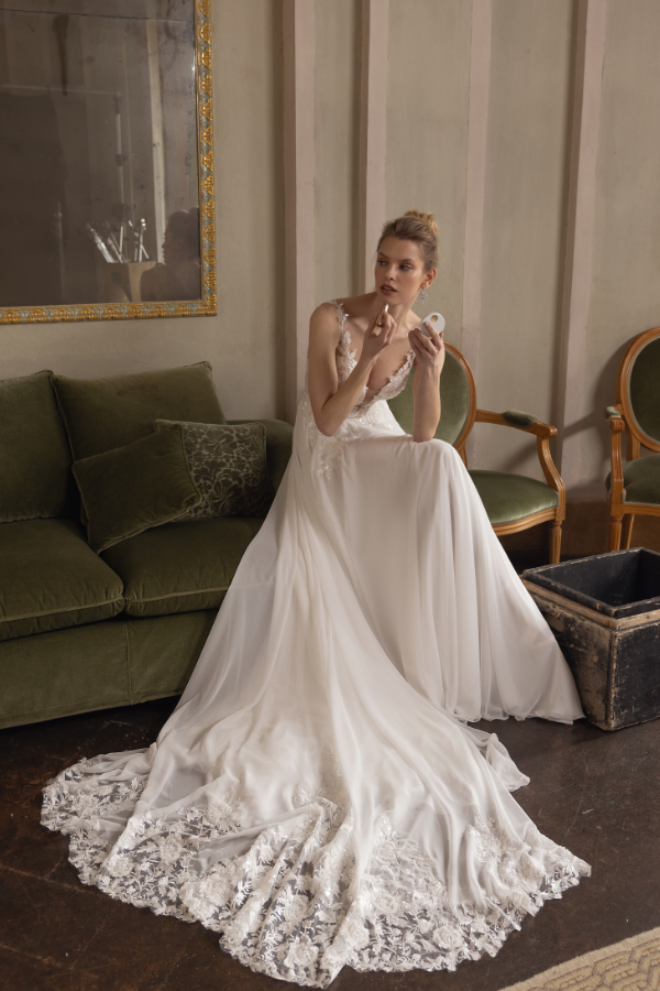 Madrid is a semi-loose-fitting gown made of soft silk tulle and Chantilly lace, with rebrodé embroidery embellishing both the bodice and the bottom of the dress, giving it a natural elegance. The bodice features a deep V-neckline, decorated with delicate thin straps. La struttura è caratterizzata da inserti illusion e coppe modellanti, che offrono un effetto sostenente e mettono in risalto la scollatura.