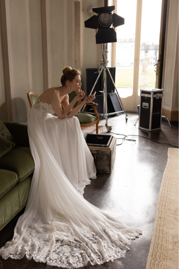 To say that Madrid is a simple wedding dress is really reductive. Rather, it is a refined creation in every detail. The star of Maison Signore’s Icons collection, Madrid is distinguished by its sophisticated use of chiffon, a material that lends an unparalleled softness and lightness. Every element, from the meticulous embroidery to the details of the bodice, is the result of a meticulous choice, aimed at satisfying the desire and need of every bride.