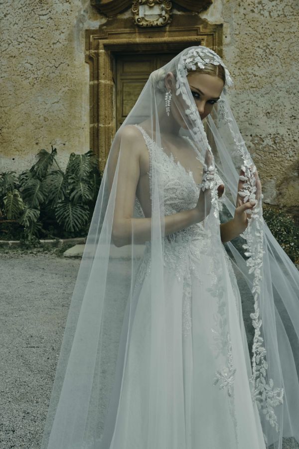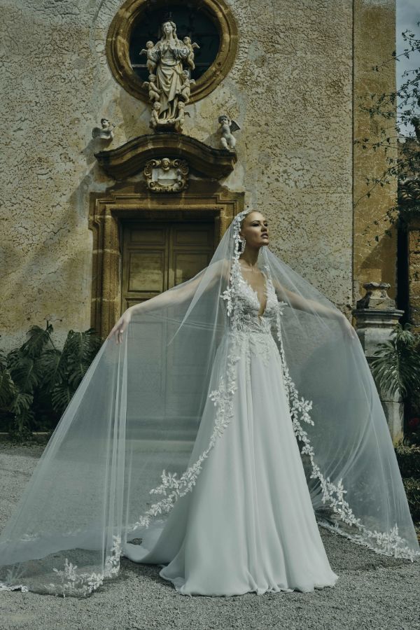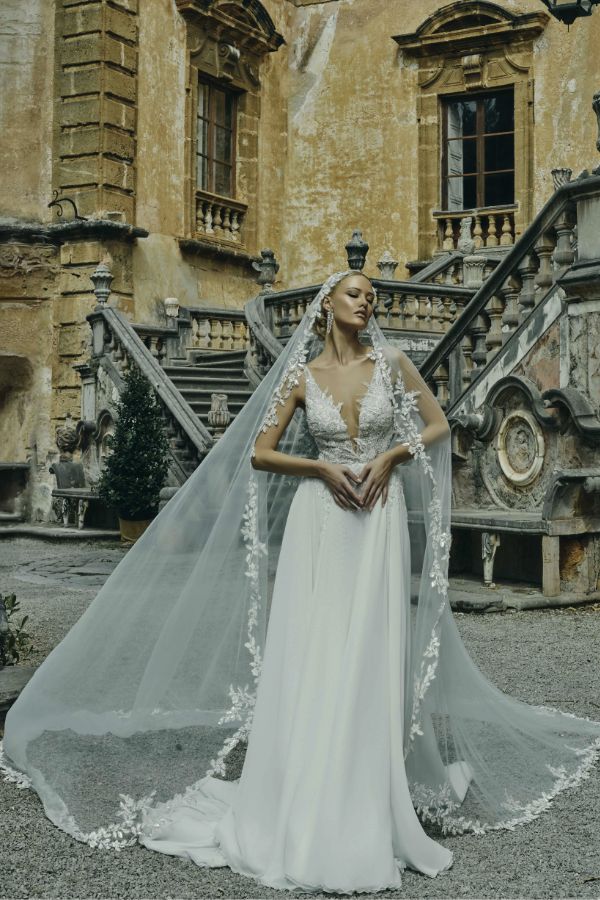 The upper part features a bodice fully embroidered with crystals and three-dimensional ramage, giving sophistication and luminosity. The deep “V” neckline in both front and back, with illusion tulle inserts, enhances the neckline in an elegant and sophisticated way.
