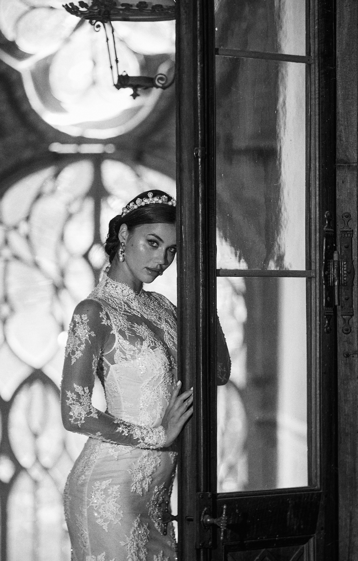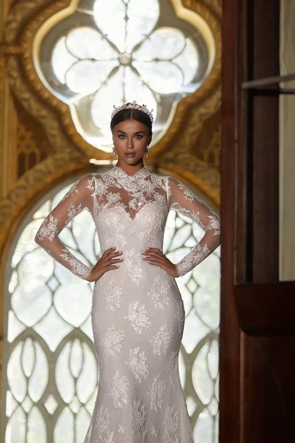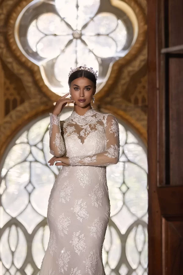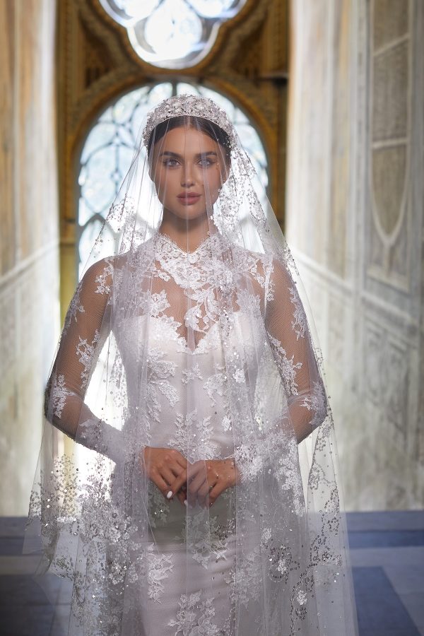 Regal in its elegance and personality. Regal for the exquisite French lace that characterizes the wedding dress. Maria Cristina is the epitome of innate sensuality, femininity, and sweetness: all converging in the dual nature of this gown.