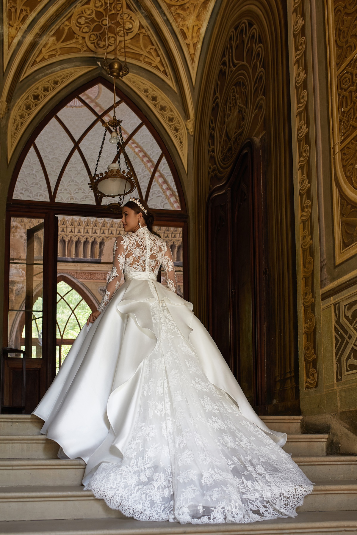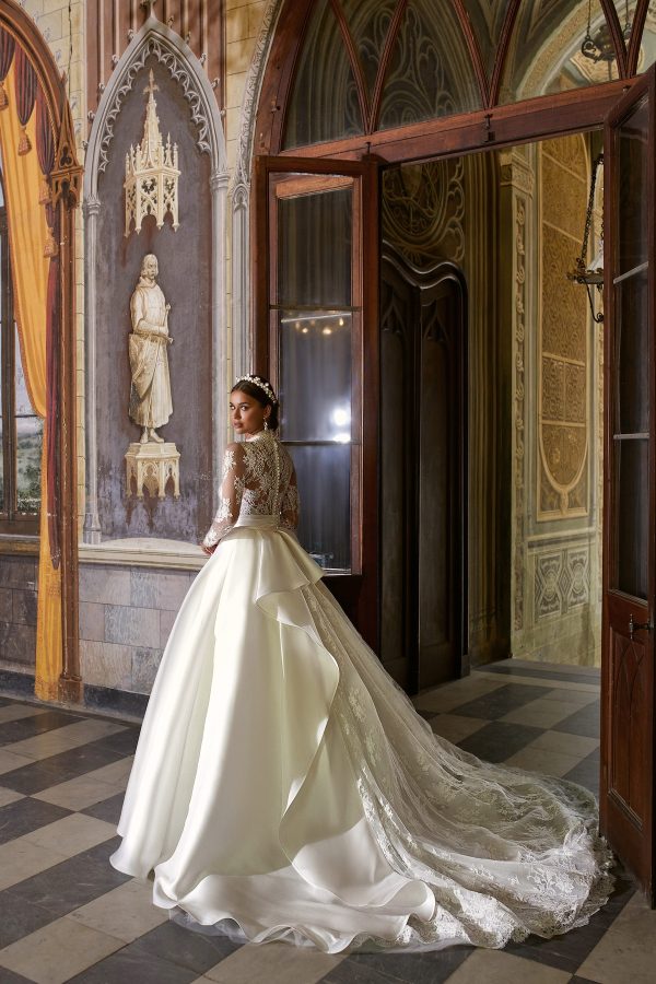 This dress is an Icons collection’s best-seller. Thanks to the addition of the overskirt, it transitions from a delicate mermaid silhouette to the majestic form of a princess gown.