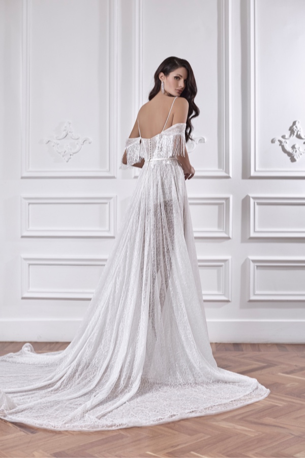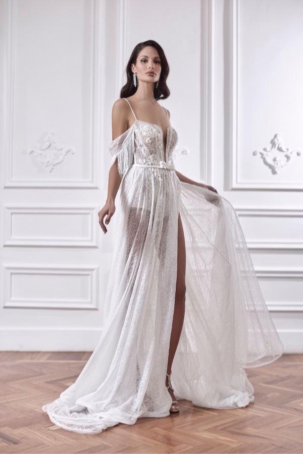 Morganite gently sculpts the silhouette and is designed to flatter every type of female body. Ideal for tall brides or Mediterranean body types, this gown is perfect for evening ceremonies, where its shimmering details truly shine. It’s best for warmer seasons, as its lightweight fabrics make it an ideal choice for spring and summer weddings.