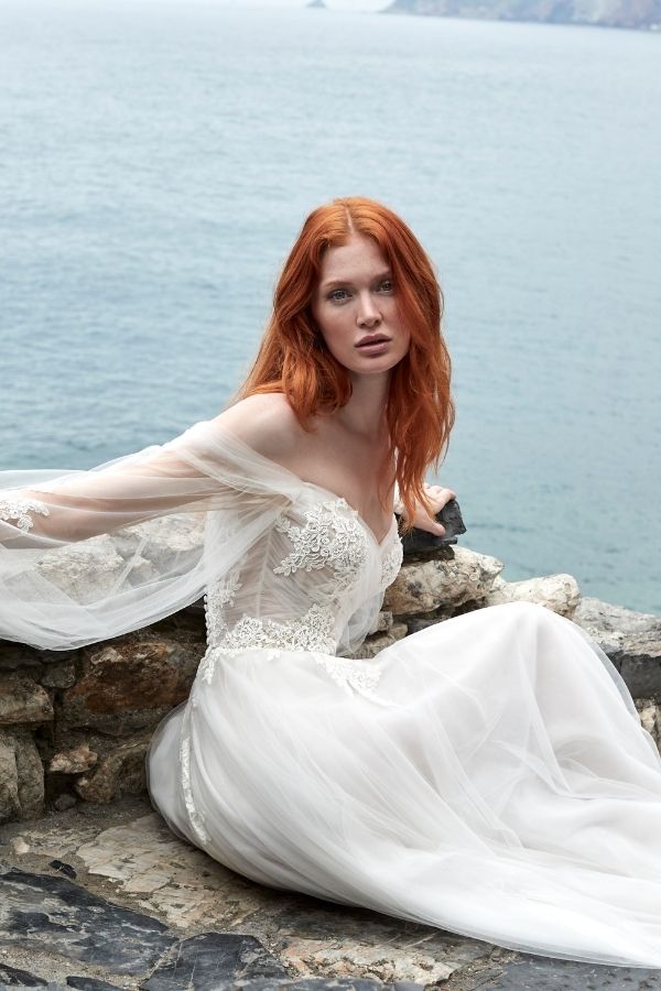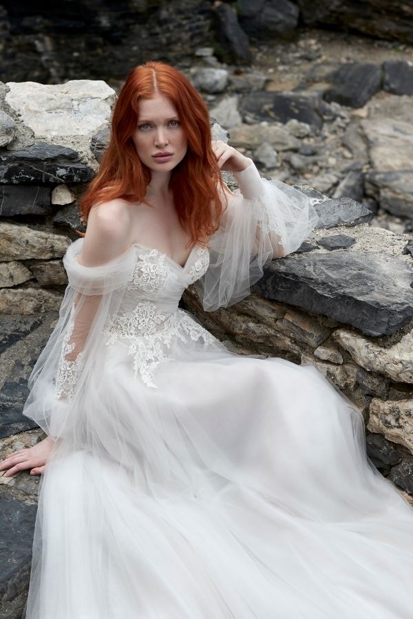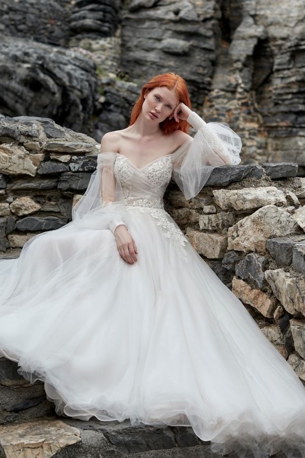 - The silk tulle sleeves offer a “princess-y” elegance.