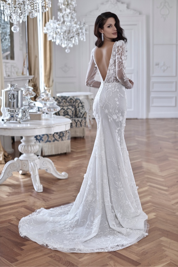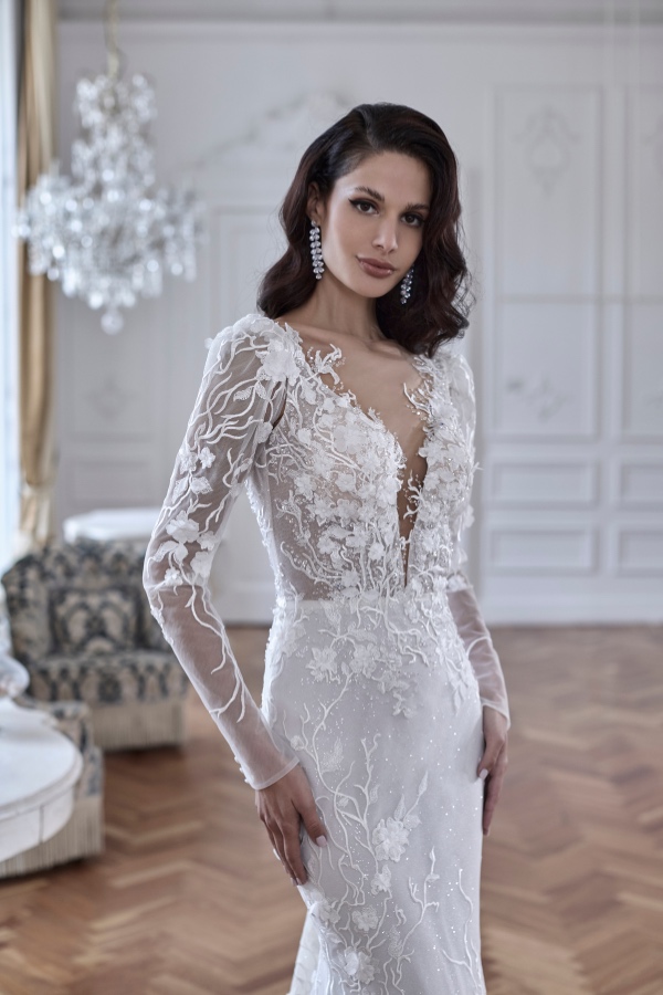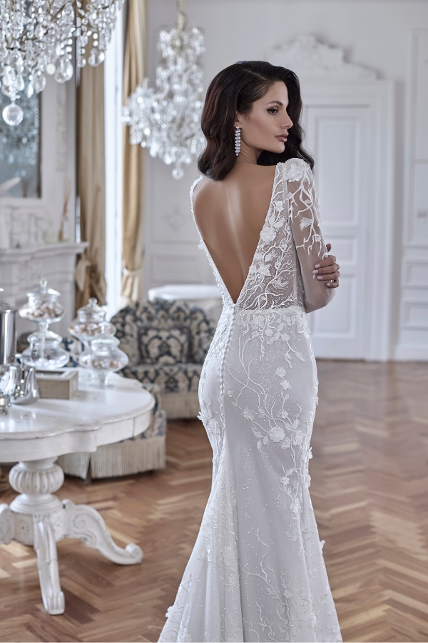 The mermaid silhouette of the skirt gracefully follows the bride’s shapes, blending the shimmer base with embroidered lace and three-dimensional appliqués. On its back, the deep V-shaped cut creates the perfect harmony between sensuality and elegance. The detachable long sleeves, made from the same lace as the bodice, offer a versatile double look.