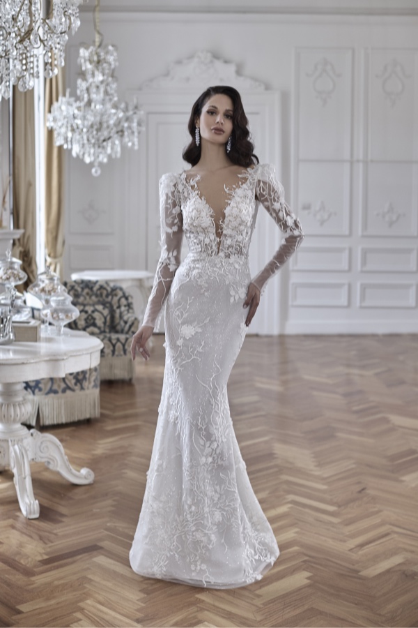 Opal is a symbol of transformation, enhancing feminine beauty in all her beautiful shades. With its embroidered lace, sparkling crystals, and sculpting design, this gown is an ode to elegance, perfect for a bride who wants to leave a lasting impression.