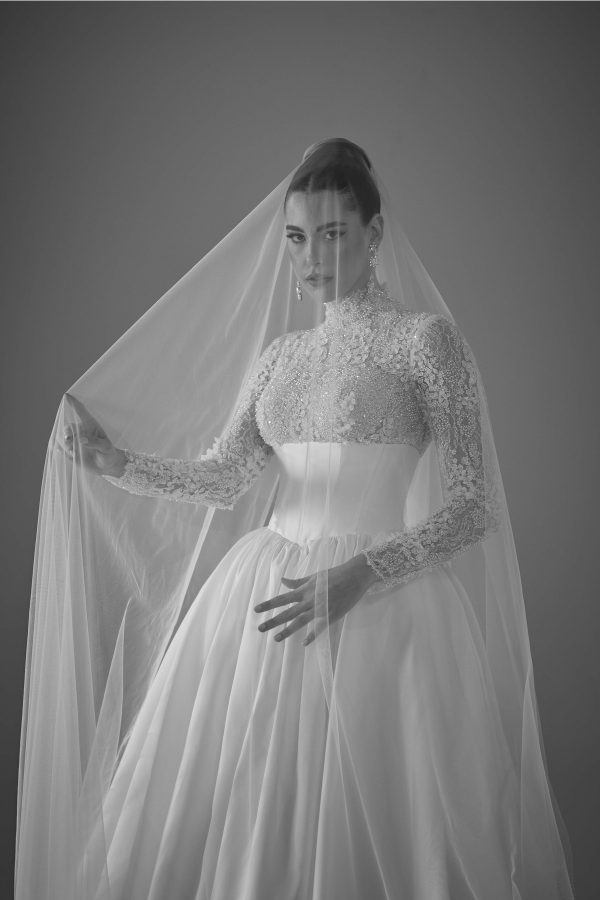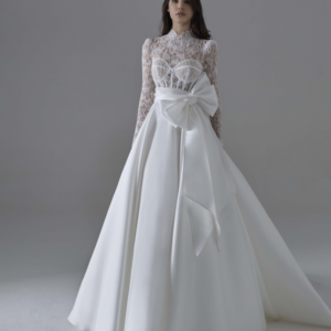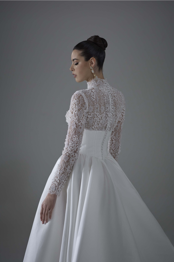 Il corpino con coppe preformate presenta un effetto bustier in mikado di seta che avvolge il busto fino al sottoseno per poi sfoggiare un prezioso pizzo chantilly ricamato con piccoli fiori 3D realizzati in pizzo, incrostazioni di perle e cristalli, che si estende con raffinatezza lungo le maniche lunghe e l’alto collo couture, fino a scendere a punta su un’ampia gonna balloon in mikado di seta pura.